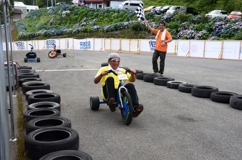 本部の手前約8k付近のスナップです、見ていると走りたくなるものですがヨッチャンは3輪車も方がピッタリのようです来年は3輪車のタイムアップをメザスゾー皆さんは1時間を目標に頑張ってください