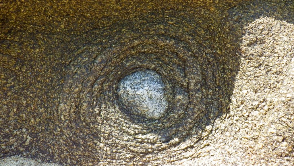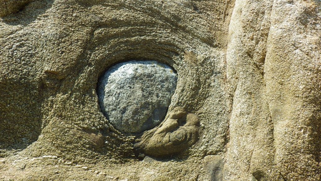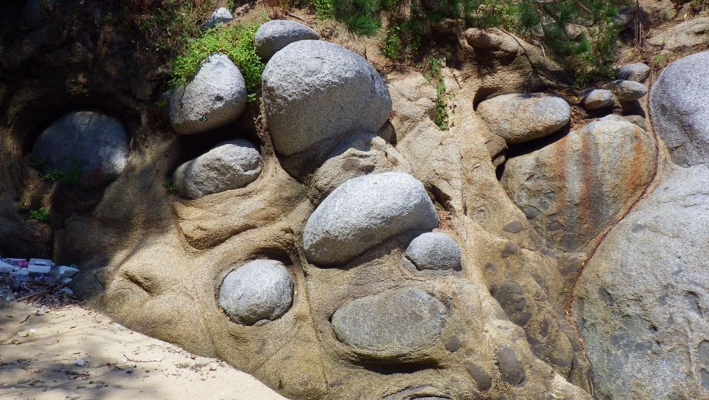 やわらかい石に包まれた白い石が侵食されて
