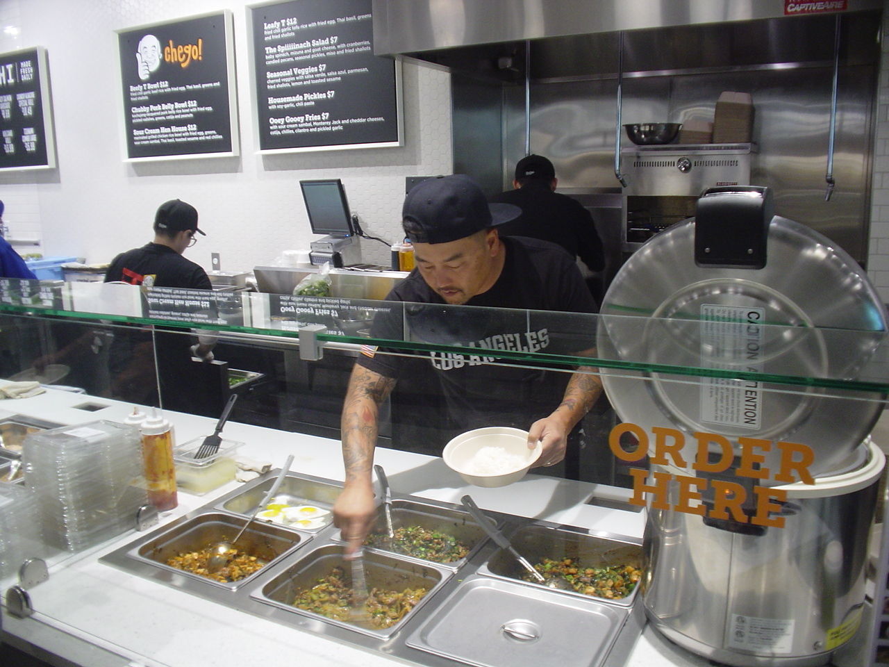 ■ホールフーズ・マーケットは11月4日、ロサンゼルス・ダウンタウンに新店をオープンした。場所はグランド通(Grand Ave.)とオリーブ通り(Olive St.)に挟まれた8番街(8th. St.)沿いだ。新店は新築アパートメントの1階にあり、地下には170台収容の専用駐車場も完備している。ロサンゼルス・ダウンタウン店の特長はこの付近に住む人や働く人のためのダイニングを兼ねたキッチンになっていることだろう。そのため地ビールやワインなどを提供する8バー(The 8 Bar)の他、屋内外に220席が設けられている。スーパーマーケット内では初のテナント出店となる「チェゴ!(Chego!)」もあるのだ。チェゴはロサンゼルスで「コギBBQタコ・トラック」で人気を博し、フードトラックブームの火付け役となったロイ・チョイ氏のアジア系フュージョン・レストランなのだ。また地下にはインスタカート専用の冷蔵庫もありダウンタウン内での配達サービスも展開される計画となっている。