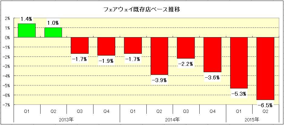 同社の株価が落ち込んでいる理由はフェアウェイからお客が逃げ出しているからだ。フェアウェイが発表した第2四半期(7月〜9月期)では売上高が1.80億ドルと前年同期の1.94億ドルから約7%も減少している。赤字は1,200万ドルとなり、前年同期の1,700万ドルの損失からは赤字幅縮小しているものの、上場直後の決算発表となる2013年第1四半期から10期連続で赤字となっているのだ。また、既存店・売上高前年同期比は6.5%の減少となり、上場後では最大の下げ幅となった。既存店ベースは客単価が3%増加したものの、客数が9.2%の減少だった。フェアウェイの既存店ベースの減少は2013年第3四半期以来、8期連続で前年を下回っている。