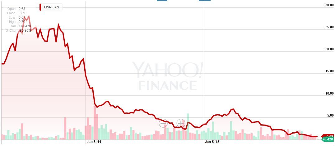 フェアウェイの株価推移。同社の株価は上場から半年間ほど、20ドル台の高値で推移していが、現在は一株当たり60セント台となっている。ピークとなった2013年7月から98%近くも落ち込んでいるのだ。12月18日現在は1株当たり69セントとなっており、フェアウェイで売っている普通のリンゴ1個さえも買えない。なお、ナスダック市場では株価が30日間、1ドル以下となれば上場廃止となる。