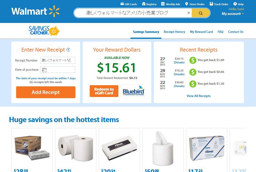 ⇒生活者の視点としてリサーチのためのショッピングは外せないのです。特にウォルマートでは買い物をするようにしています。セービング・キャッチャーを研究するためです。調査して分かったことは、ウォルマートがある地域(競合状態)と買い物をする時期、そして購入商品によってセービング・キャッチャーの効果が大きく変わってくるということです。それを検証するため先日、競合店の多い場所にあるウォルマートで、スーパーなど競合店が販促を強化する時期に、セールされやすい人気のナショナルブランド商品を買ってセービング・キャッチャーを試してみました。案の定、結果は12アイテム購入(2アイテムはデリのチキンとバッグ)中、5アイテムが比較対象となり3つの競合店(ラルフス、アルバートソンズ、ターゲット)のセール価格から差額金が還元されました。差額は1.60ドルと少額ですが、それでも「We've found a lower price(安値を見つけました)」とのメール通知は、消費者としてとても嬉しい気持ちになります。