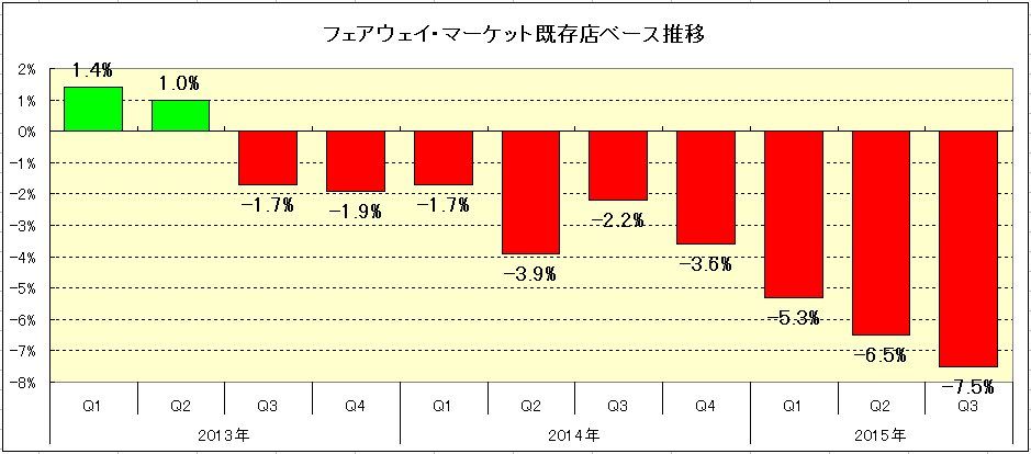 フェアウェイが発表した第3四半期(10月〜12月期)では売上高が1.9億ドルと前年同期の2.1億ドルから約7%も減少している。赤字は970万ドル。前年同期の1,100万ドルの損失からは赤字幅が縮小しているものの、上場直後の決算発表となる2013年第1四半期から11期連続で赤字となっている。また、既存店・売上高前年同期比は7.5%の減少となり、上場後では最大の下げ幅となった。既存店ベースは客単価が1%増加したものの、客数が8.5%減少した。フェアウェイの既存店ベースの減少は2013年第3四半期以来、9四半期連続で前年を下回っている。