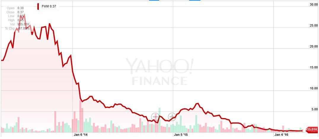 フェアウェイの株価推移。同社の株価は上場から半年間ほど、20ドル台の高値で推移していが、現在は一株当たり36セントとなっている。ちょっと意地悪な見方だが、上場後、ピーク時に27ドルをつけた株価が3年で100分の1近くになったスーパーマーケットは他に比べる対象がないほど「唯一無二のスーパー(Like No Other Market)」となっているのだ。