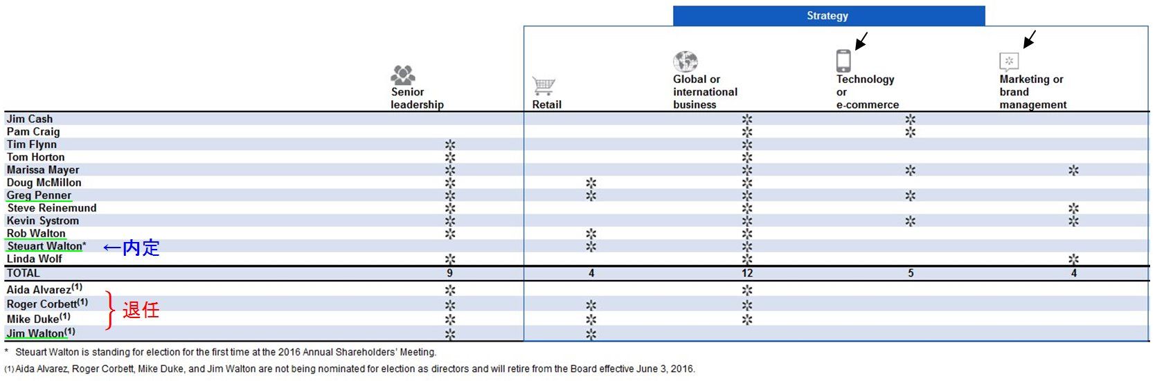 ウォルマートの取締役員人事。表にあるのようにアイダ・アルバレズ氏(66)、ロジャー・コーベット氏(73)、マイケル・デューク氏(66)、ジム・ウォルトン氏(67)が退任し、ジム・ウォルトン氏の子息で創業者の孫にあたるスチュワート・ウォルトン氏(34)が取締役員に内定している。取締役員は15名から12名に縮小され、中央年齢(median age)が66歳から57歳と若返る。年齢構成は50歳以下が5人、50〜59歳は3人、60〜69歳は3人、70〜75歳は1一人だ。性別では女性3人、男性が9人となる。今回の人事で(矢印で示しているように)ITやEコマースに精通し、マーケティングやブランド・マネジメントの経験がある役員の割合が高くなっている。緑色の下線はウォルトン家親族。
