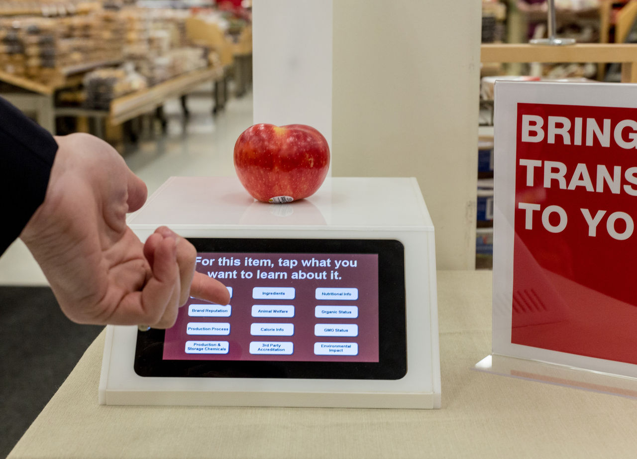 トップ画像:ミネソタ州イーダイナ地区のターゲットで行われている「食品の透明化(food transparency)」テスト。スマートスケールと呼ばれる計量器に果物を置くとスクリーンに栄養価やカロリー、生産方法、オーガニックもしくはGMO状況、生産時の環境インパクトなどのコンテンツメニューが表示される。ターゲットの研究部門「フード・フューチャー・コーラボ」はスマートスケールのテストから顧客にとって何が重要な食品コンテンツなのかを研究しているのだ。