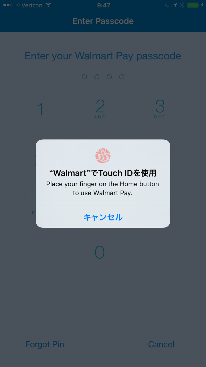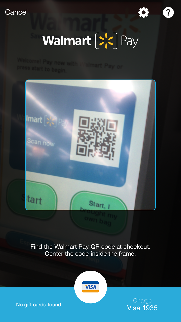 ウォルマートでウォルマートペイを使用する場合は、ウォルマートアプリを起動し、メインメニューからウォルマートペイを選択する。タッチIDの指紋認証(もしくは4桁のパスコード)でカメラを起動し、レジ・スクリーンに映っているQRコードをスキャンする。スマートフォンとレジがつながった後に商品をスキャンしていく。