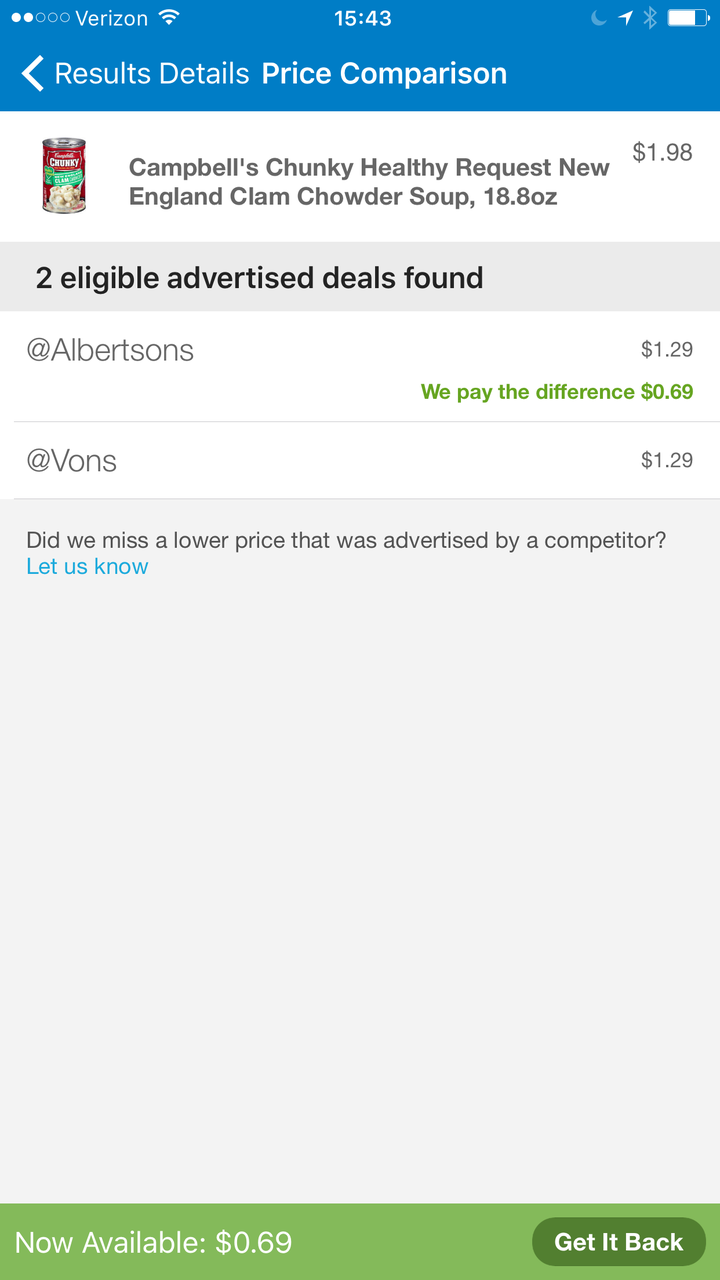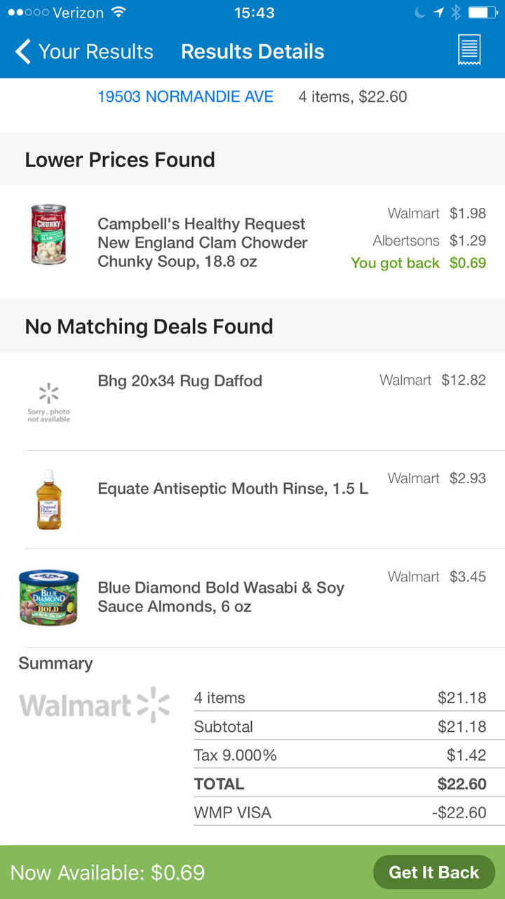 セービングキャッチャーが近所のボンズとアルバートソンズでセールになったキャンベルスープ缶(1.29ドル)を見つけた。ウォルマートで1.98ドルで購入していたので、差額分69セントのバックとなった。ウォルマートペイからワンタップのセービングキャッチャー機能で簡単に節約でき、シームレスな報酬体系をリアルに感じた。これは感激だ。