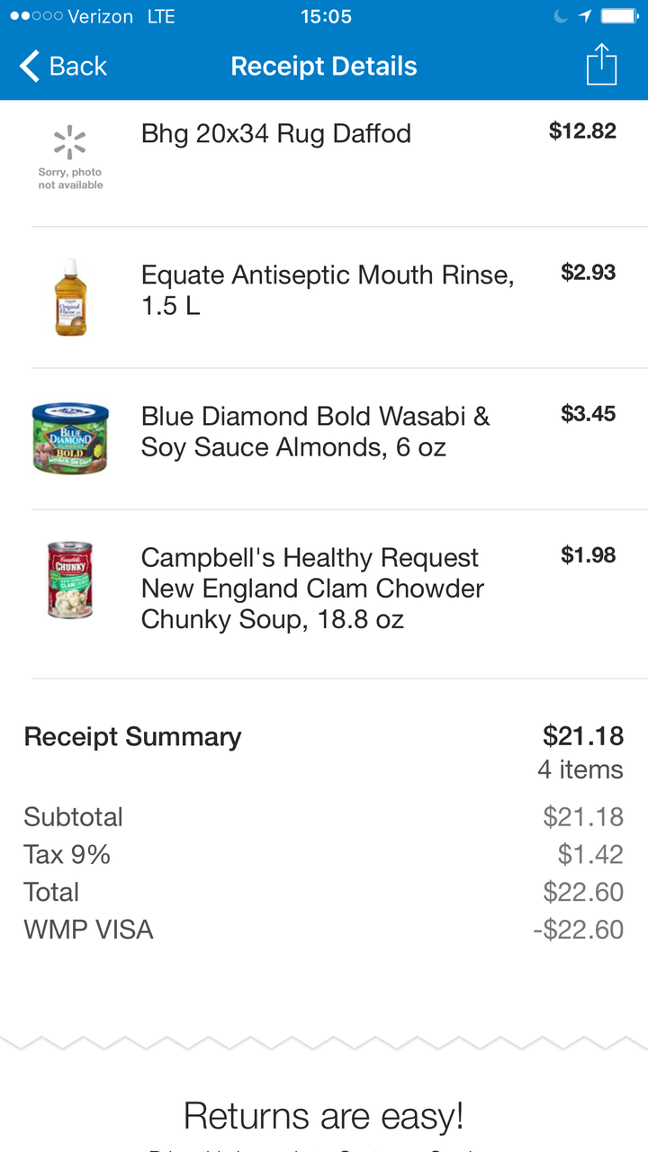 電子決済が完了するとスマートフォンに「お支払いありがとうございました」と表示される。「セービングキャッチャーにレシートを送る(Submit Receipt to Savings Catcher)」をタップするだけで、ペーパーレシートをスキャニングする手間も無く、セービングキャッチャー機能を利用できるのだ。購入した商品が画像と共にeレシートで表示される(アップルペイではこのようなeレシートはない)。スクリーン下に「返品は簡単です(Returns are easy)」とあるが、商品を返品する時はこの下に表示されているバーコードで処理が可能となる。eレシートなので、紙レシートを失くすこともなくなるのだ。