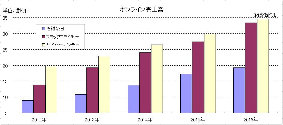 客数で実店舗を上回ったオンラインでもスマートフォンなどモバイル経由の売上が昨年以上に伸長した。ソフトウェア大手アドビシステムズの調査部門アドビ・デジタル・インサイツ(ADI) によると、感謝祭週末4日間とサイバーマンデーを含む5日間のEコマース売上高は前年同期比15%増となる128億ドルだった。感謝祭日のオンライン売上高は前年から11.5%増となる19.3億ドルだった。感謝祭日の翌日のブラックフライデーではオンライン売上が前年比21.6%増となる33.4億ドルだった。モバイル経由のオンライン売上は前年から33%増と記録的な伸びとなり12億ドルとなった。経由売上の内訳は全体の64%がデスクトップ経由を占める一方で、スマートフォンとタブレットのモバイル経由は36%となっている。サイバーマンデーでは、週末4日間のオンライン売上が伸びていたことで需要の先食いが予想されたものの、売上高は前年比12.1%増となる34.5億ドルとなった。