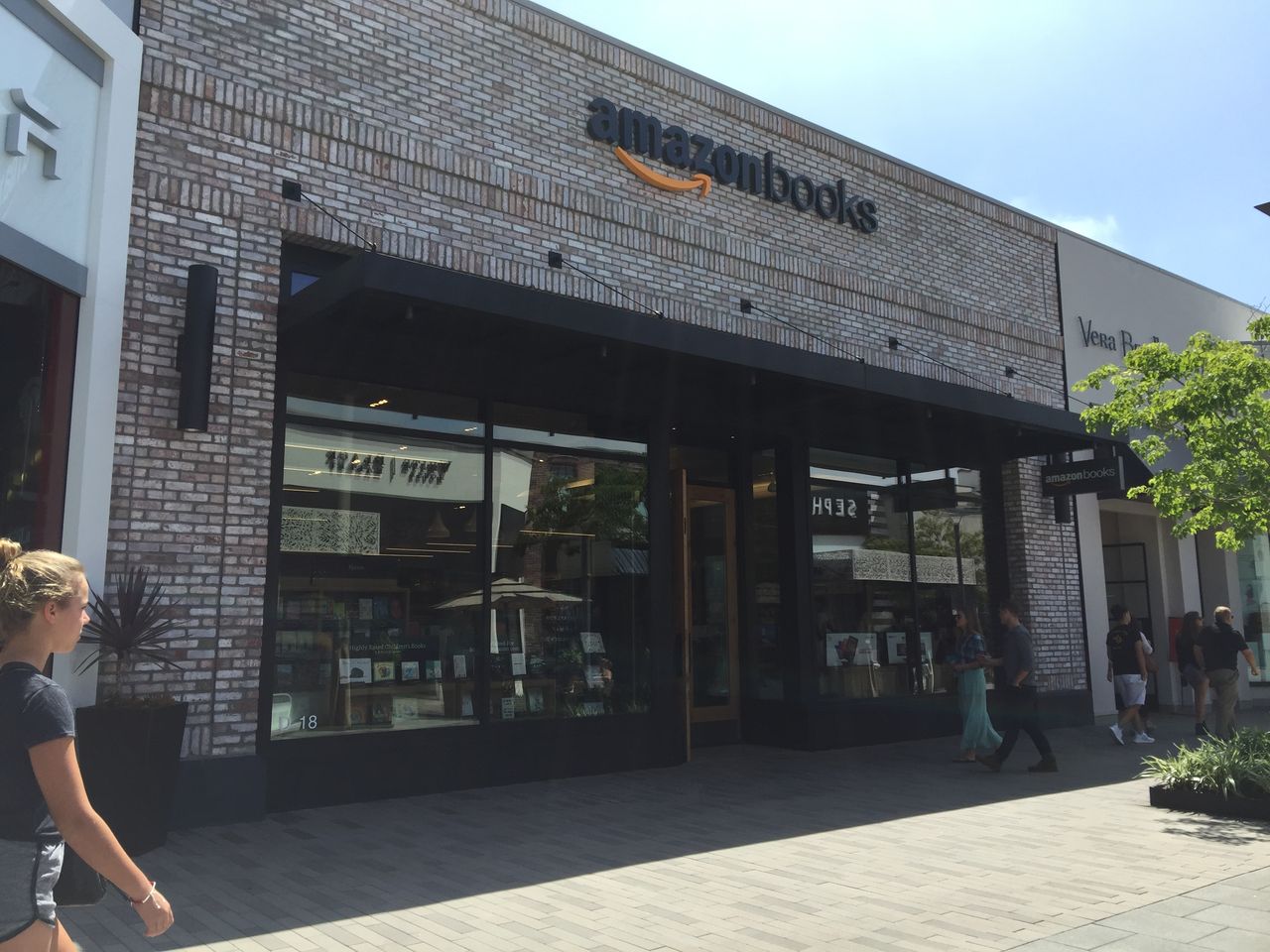 アマゾンが1年前にオープンした実店舗はリアル書店の「アマゾン・ブックス(Amazon Books)」だ。アマゾンブックスは、顧客からの評価の高い書籍に絞り込み、表紙を正面に向けて陳列する「面陳(面陳列)」や「面展(面展示)」で陳列している。すべての書籍には星数評価やカスタマーレビューを記載したカードも添えられている。一方で書籍価格はアマゾンストアと同一となっており、プライスカードによる価格提示は行っていない。本が気に入らなかった場合など購入から30日以内に返品すれば返金する返品制度もある。アマゾンブックスには書籍のほか、アマゾンが手がける電子書籍用リーダーのキンドルなど各種デバイス、アクセサリー類も並べられ販売されている。アマゾンブックスはワシントン州シアトル地区のユニバーシティ・ビレッジ(University Village)の1号店に、9月にサンディエゴ郊外のウエストフィールドUTCモール(Westfield University Towne Center Mall)にオープンした2号店、10月にオレゴン州タイガード地区のワシントン・スクエア(Washington Square)内にオープンした3号店がある。アマゾンブックス4号店はシカゴ市内で、地元レストランなどが集まる商店街「サウスポート・コリドー(Southport Corridor)」に来年オープン予定だ。