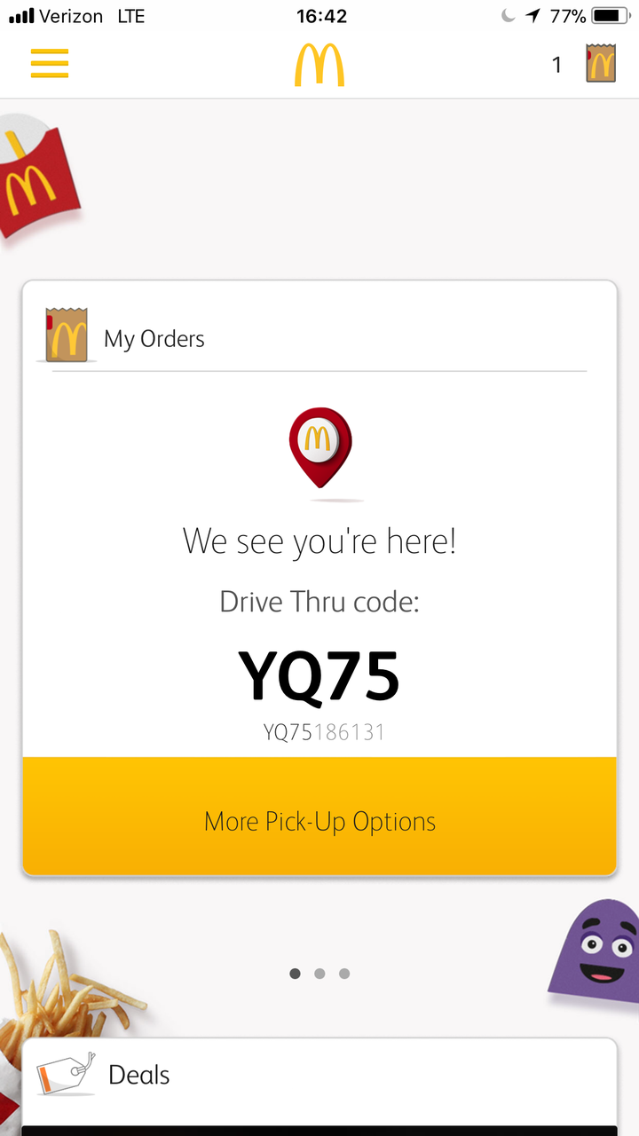 ピックアップするマクドナルドに行くと、ジオフェンシング技術で注文者が店の近くにいることを把握し「到着しましたね!(We see you're here!)」の画面となる。後は自分の好きなピックアップ方法(ドライブスルー、店内、カーブサイド・ピックアップ)を行う。