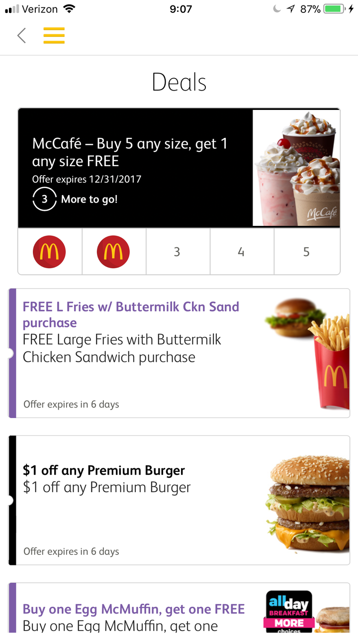 「お得メニュー(Deals)」のトップにあるのは、これまでの注文履歴からマックカフェメニューがポイント制になっていることがわかる。マックカフェのコーヒーやラテなどを5つ注文していけば、アイスコーヒーなどが無料となるのだ。その下には期間限定(6日間)で「チキン・サンドイッチとフレンチフライ大サイズ注文で二つ目が無料」「プレミアムバーガー1ドル引き」などがある。