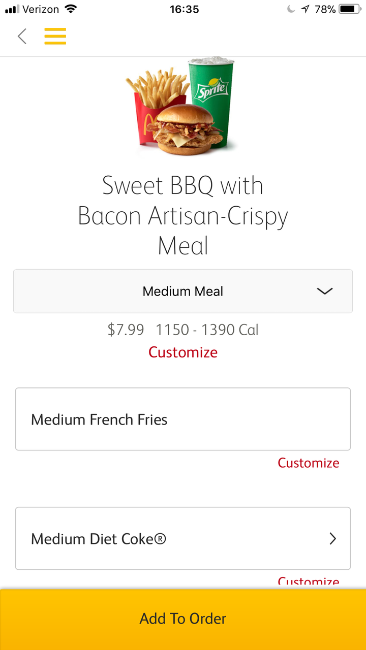 食材の品質にこだわったアップグレード・サンドイッチ・メニュー「シグネチャー・クラフテッド(Signature Crafted)」から「スイートBBQベーコン・アーティザン・クリスピー(Sweet BBQ with Bacon Artisan-Crispy)」をタップすると単品とドリンクとフレンチフライのセットメニューを選択できるようになっている。