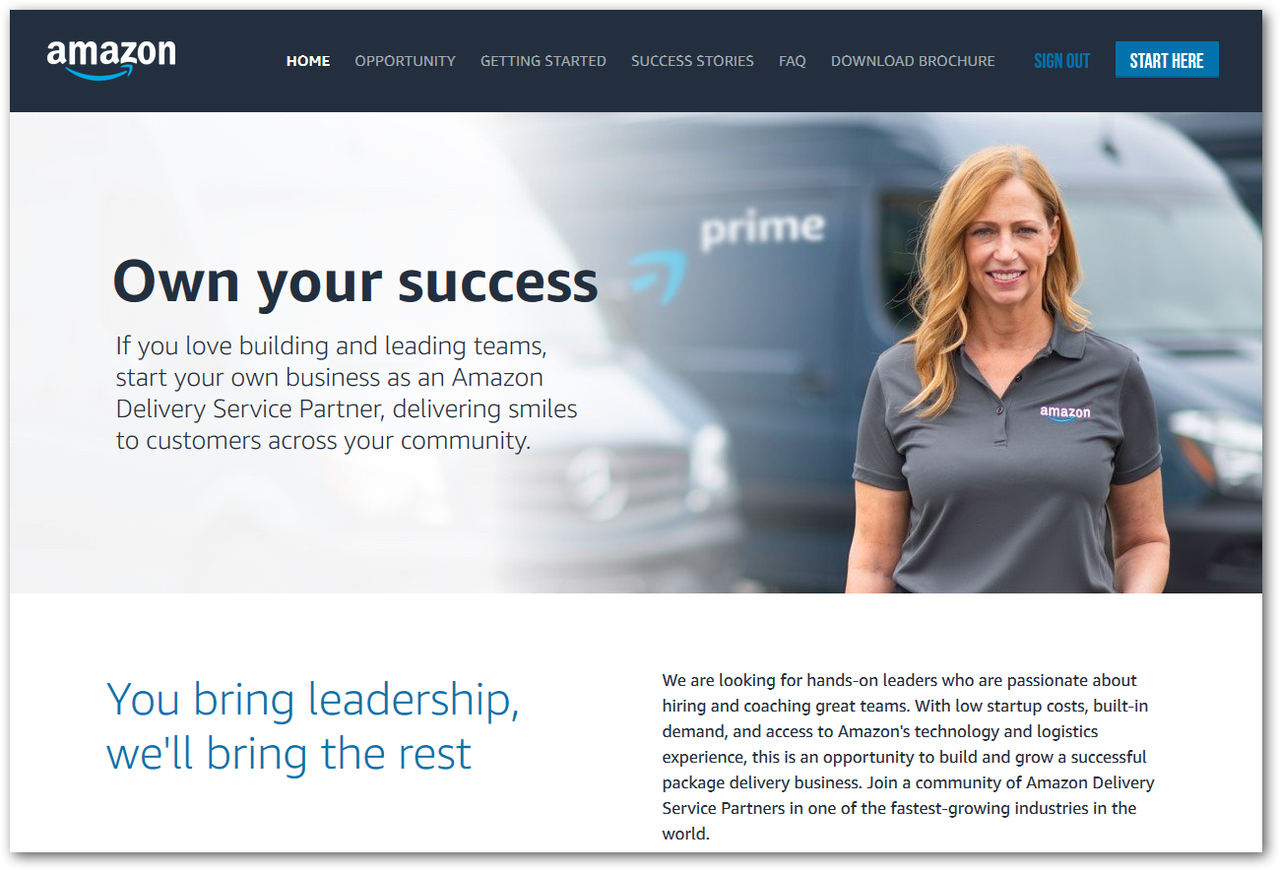 アマゾン・デリバリー・サービス・パートナーは時給18ドル〜25ドルでアマゾンの商品配達を手伝うアルバイトプログラム「アマゾン・フレックス(Amazon Flex)」とは異なり、アマゾン商品を配達する配達事業を起業するアントレプレナーを支援するプログラム。