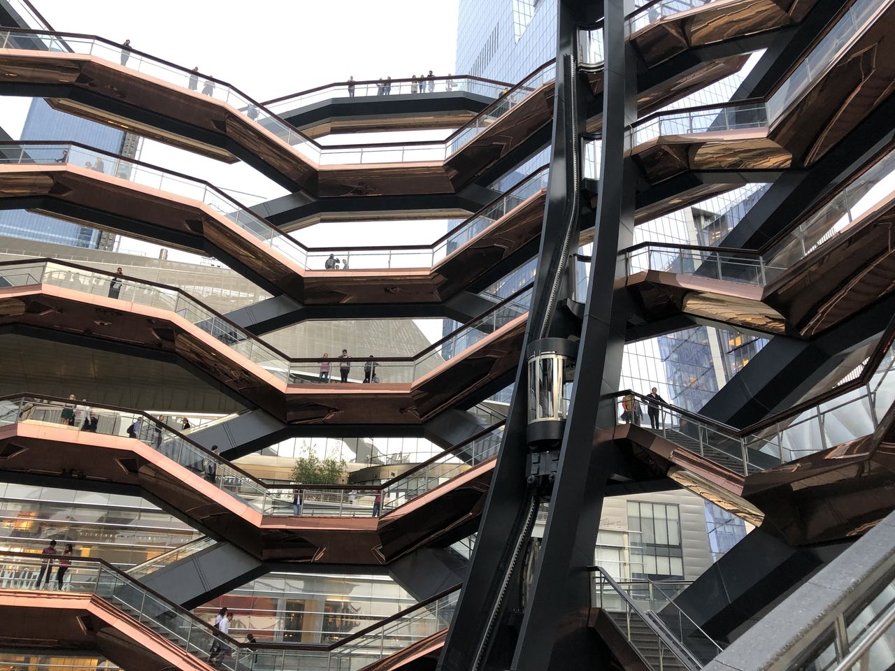 Vessel)に登るのはいまのところ無料ですが、オンライン予約が必要です。先日のニューヨーク視察では参加者のためにオンラインチケットを入手しようとしましたが、2週間前でも希望していた時間帯のチケットはソールドアウトになっていました。「どーしよう?」と心配しましたが、行ってみると当日チケットは手渡しされていました。で、視察前、確認のため後藤は一人でベッセルに登ってみたのです。感想は「怖い」と「疲れた」。ベッセルは合計で2,500段近くとなるステップに80ヶ所の踊り場があり、高さは150フィート(約45メートル)になります。エレベーターは動いておらず自分の足で上がらなければなりません。トップまで行くともうコワい、コワい。高所恐怖症ではありませんが、絶妙な高さで下は見れたものではありません。で、再び階段をつかって降りるとドッと疲れます。運動して気持ちがいいものの汗でびっしょり。で、疲れる...