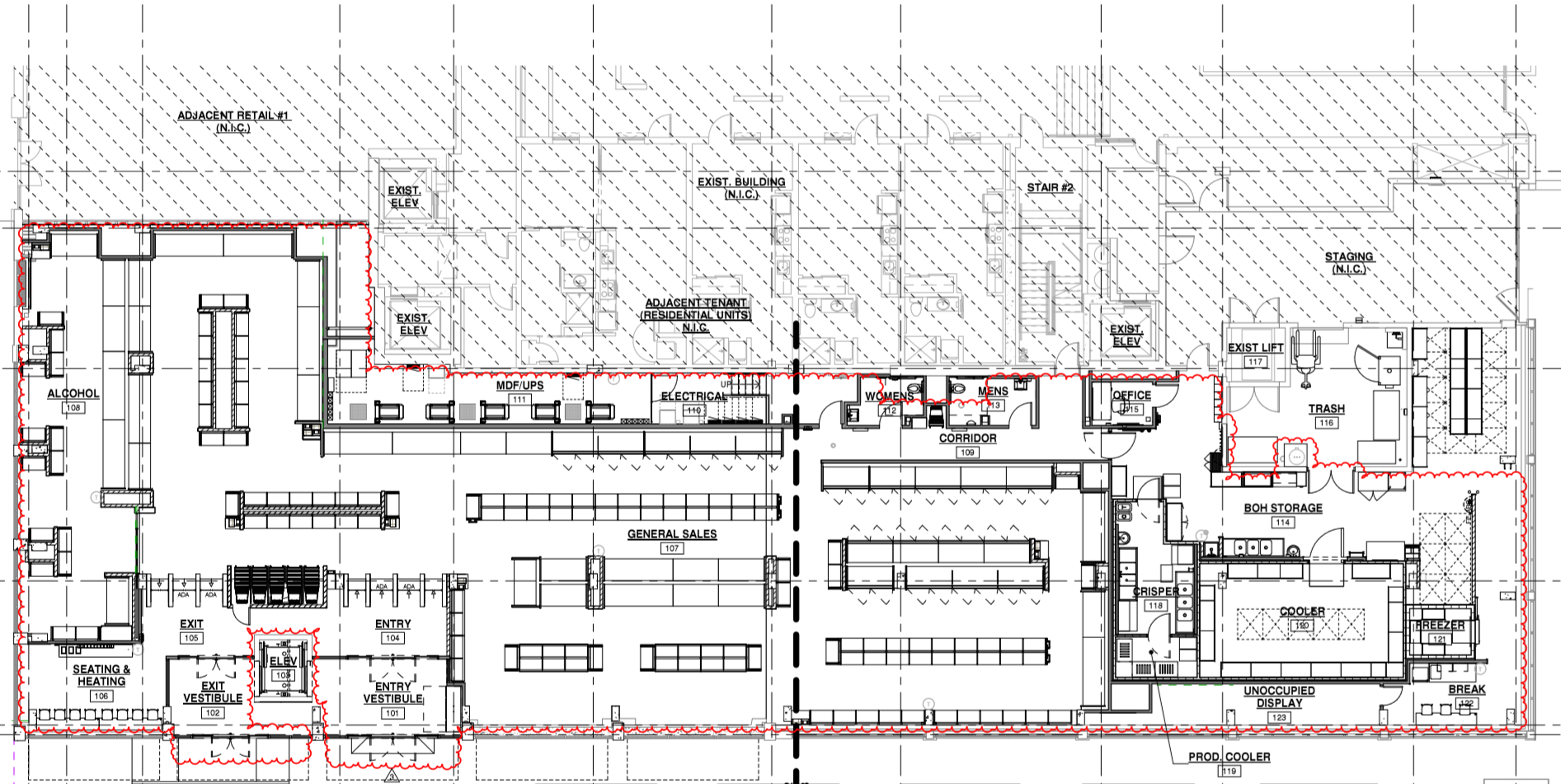 店内には従来の小売店にあるようなチェックアウトレーンは描かれていないため、レジなし店舗とみられている。図面からアルコール販売も予定していることがわかっている。