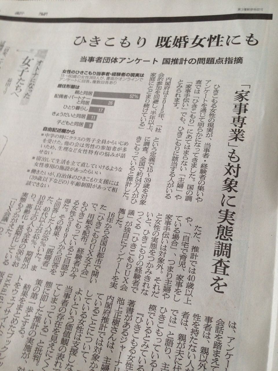 ひきこもりUX会議では、2017年「女性のひきこもり・生きづらさについての実態調査2017」を実施しました。調査に回答いただいた方は、ひきこもりの当事者支援の対象から外されがちな40代以上が40%を上回り、男性に苦手意識があると回答した人は、全体の約64%にのぼりました。