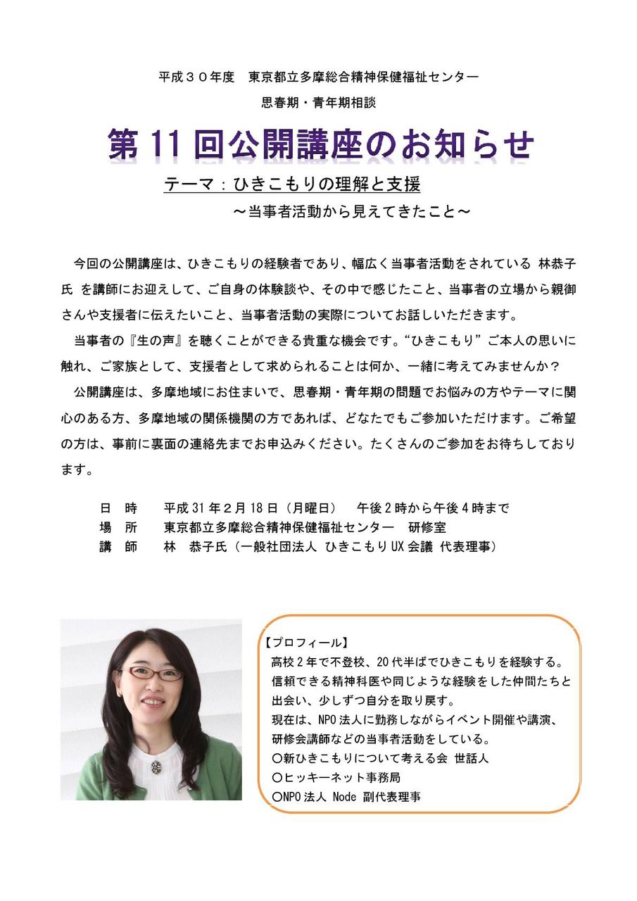 イベント告知:2/18多摩総合精神保健福祉センター公開講座「ひきこもりの理解と支援~当事者活動から見えてきたこと~」