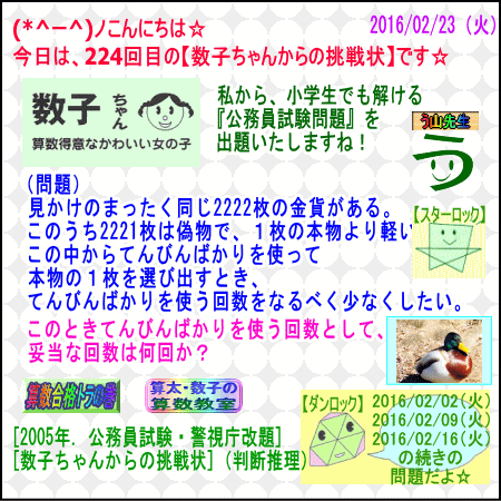 【数子ちゃんからの挑戦状2016】(公務員試験)[判断推理]224※───────────────────────────────※