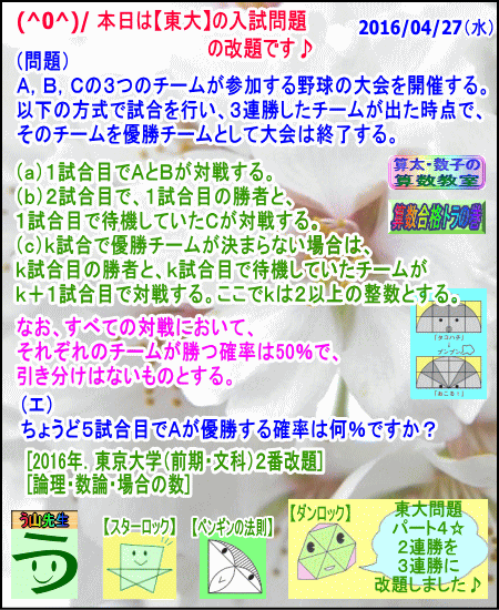 この問題は、「確率」の問題を「場合の数」に改題しました☆