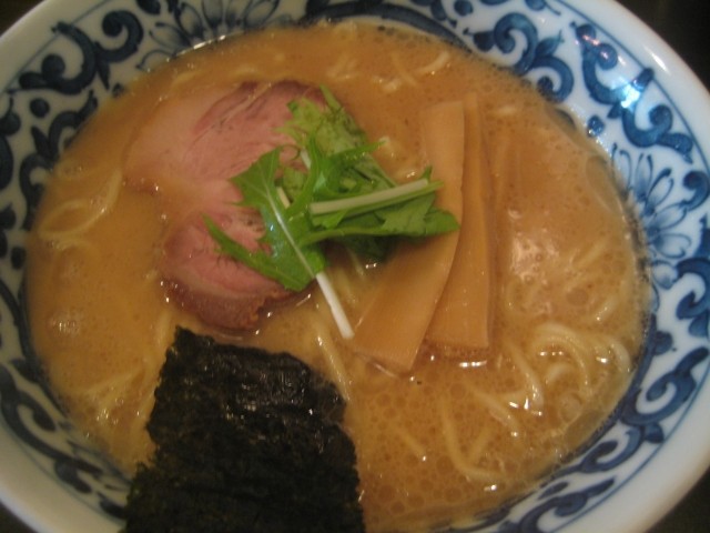 濃厚豚骨魚介系のスープが売りの店だそうです。店の外に券売機があってそこで食券を買います。「つけそば」や「ガーリックまぜそば」なるものに非常に心惹かれましたが、初突入は看板メニューでいきたいのでグッとこらえて・・・