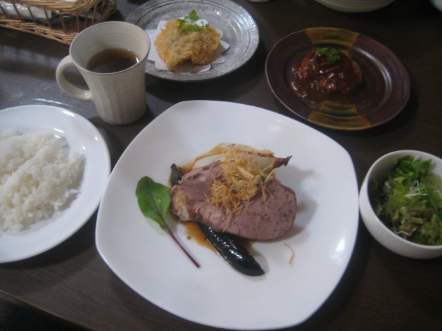 サラダ、スープ、ドリンクが付きます。サイドメニューのチキンカツは250円と安かったんでなんとなく付けてみた(笑)秋だったんで季節野菜はナス。久々お上品な感じのランチを食べた気がしましたわ(^^)うまし!