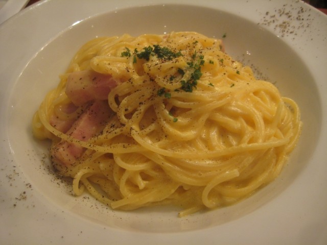濃厚で黒胡椒の効いた王道カルボナーラでやんす。最初これに迷ったけど最初に濃ゆいカルボナーラ食べたら後が入らなくなると予想して控えたら友達が注文。何としても2皿は食べると決めてた俺との違いですな(~_~;)