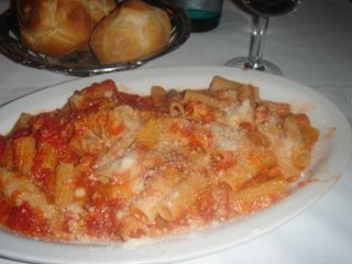 リガトーニとほぼ同じ形をした牛の小腸のトマト煮込みソースの