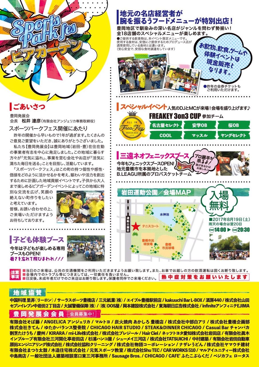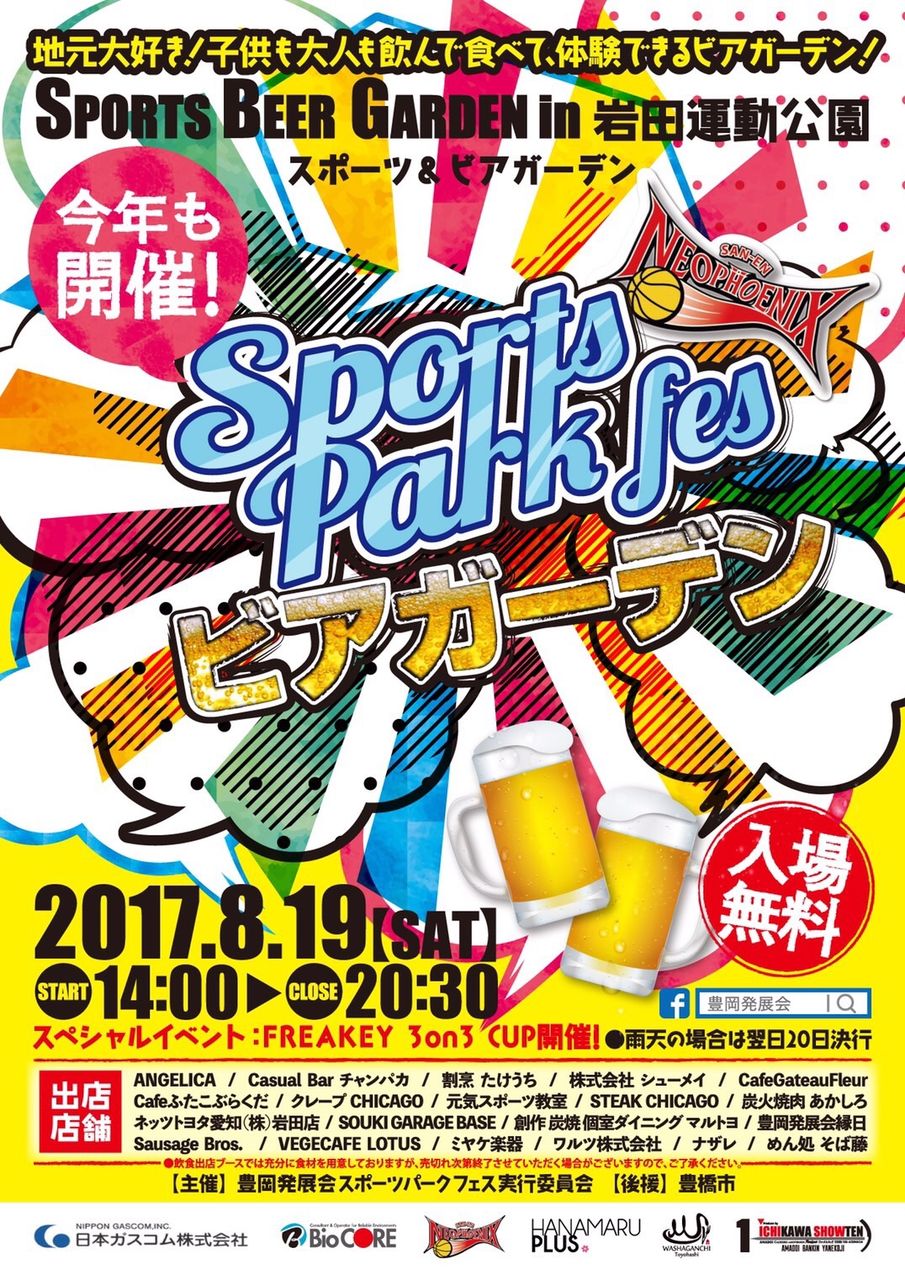 地元の豊岡発展会が主催する、スポーツパークフェスという催しが8/19、岩田運動公園で行われます。