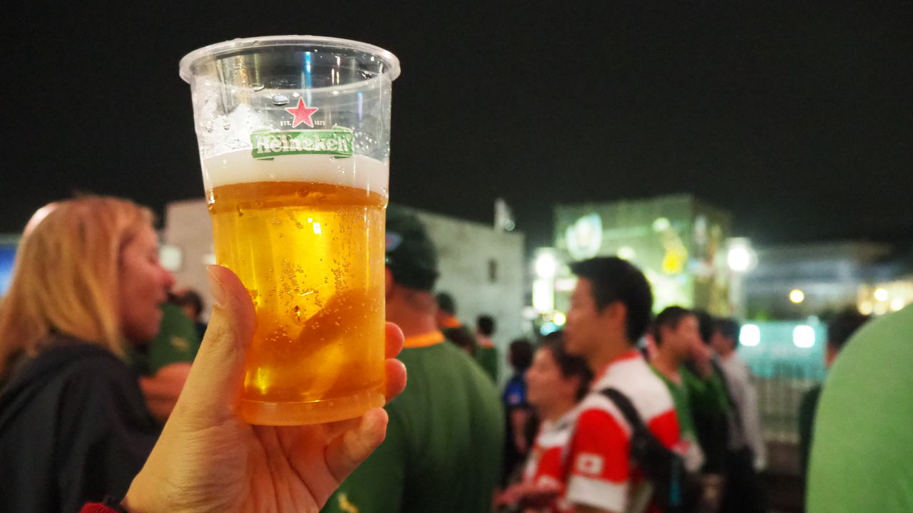 あまりの嬉しさで、僕は今大会初めてハイネケンを飲みました。家に帰れば自分なりの記録も書かねばならないので、飲んで眠くなったりするのは避けていたのですが、この夜は飲まずにはいられませんでした。美味かった!この日のハイネケンは一生ものの味でした。カップを手にコンコースを歩けば、たくさんの人が祝杯をあげ、「Cheers!」と声を掛けてきます。南アフリカのジャージを着た知らない人や日本のジャージを着た異国の人との乾杯は、スタジアムを去る寂しさを紛らわせてくれました。