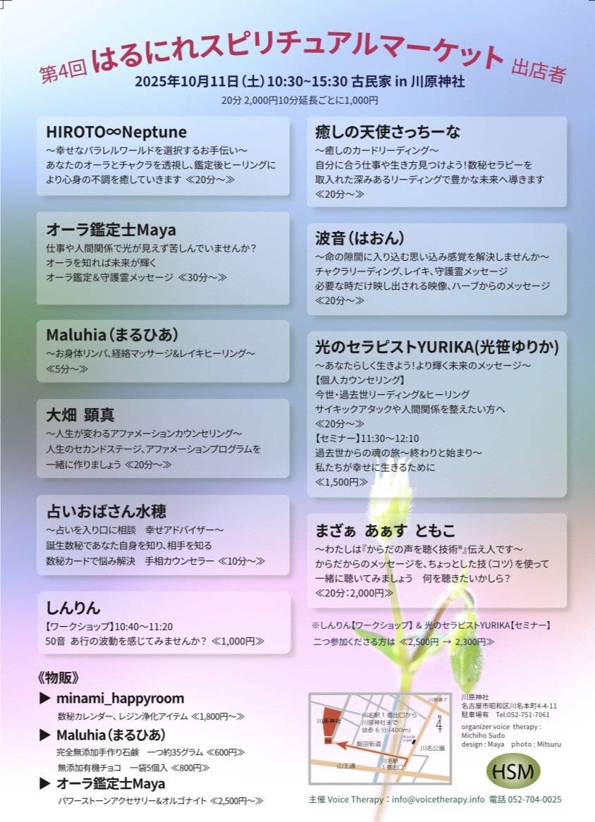 声についてボイスセラピーで気づいたこと、ちょっとしたアドバイス、絵本や詩についてのカウンセリングについて、スピリチュアルなメッセージを書いていきます。ボイスセラピーの情報もお知らせします。