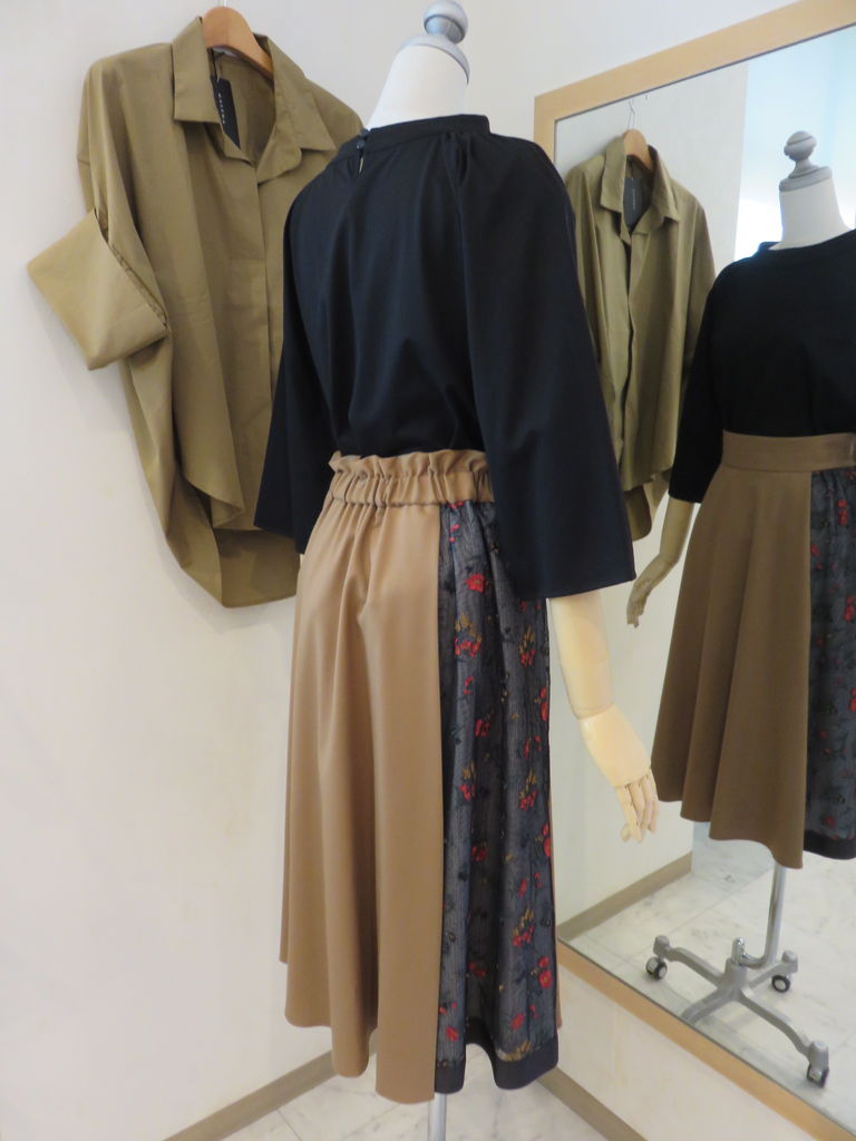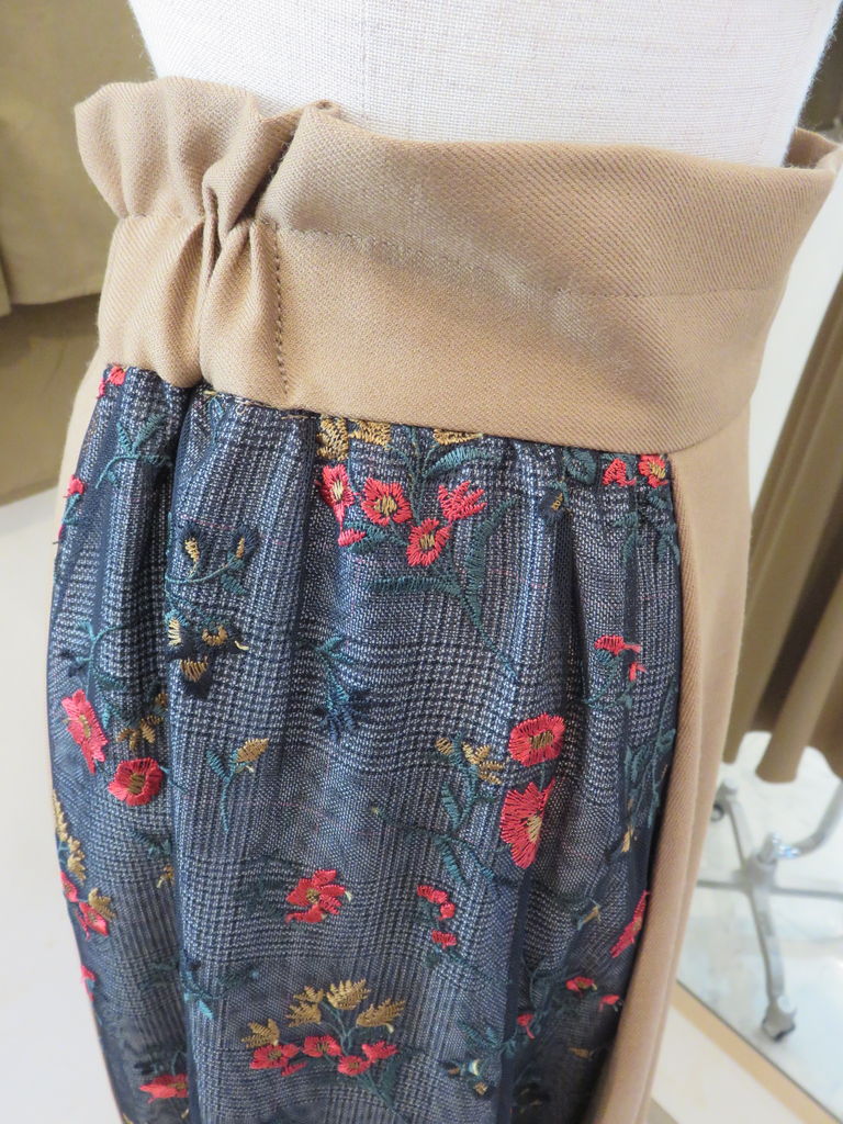 グレンチェック地にフラワー刺繍入りチュールを重ねた異素材ドッキングアシメトリーフレアスカートを紹介します。
