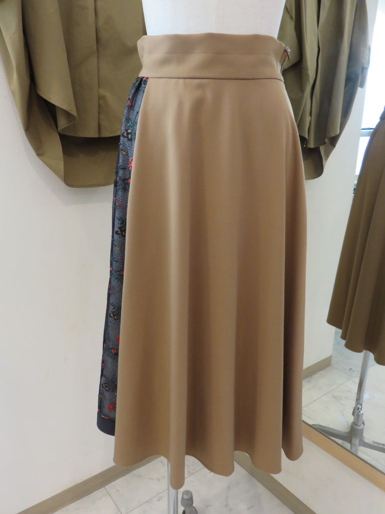 ☆異素材ドッキングアシメトリーフレアスカート(ポリエステル/毛/ポリウレタン チュール:ナイロン チェック地:レーヨン/ポリエステル/リヨセル) 丈70 サイズ38(9号) キャメル ¥21,000+税(La SRIC)