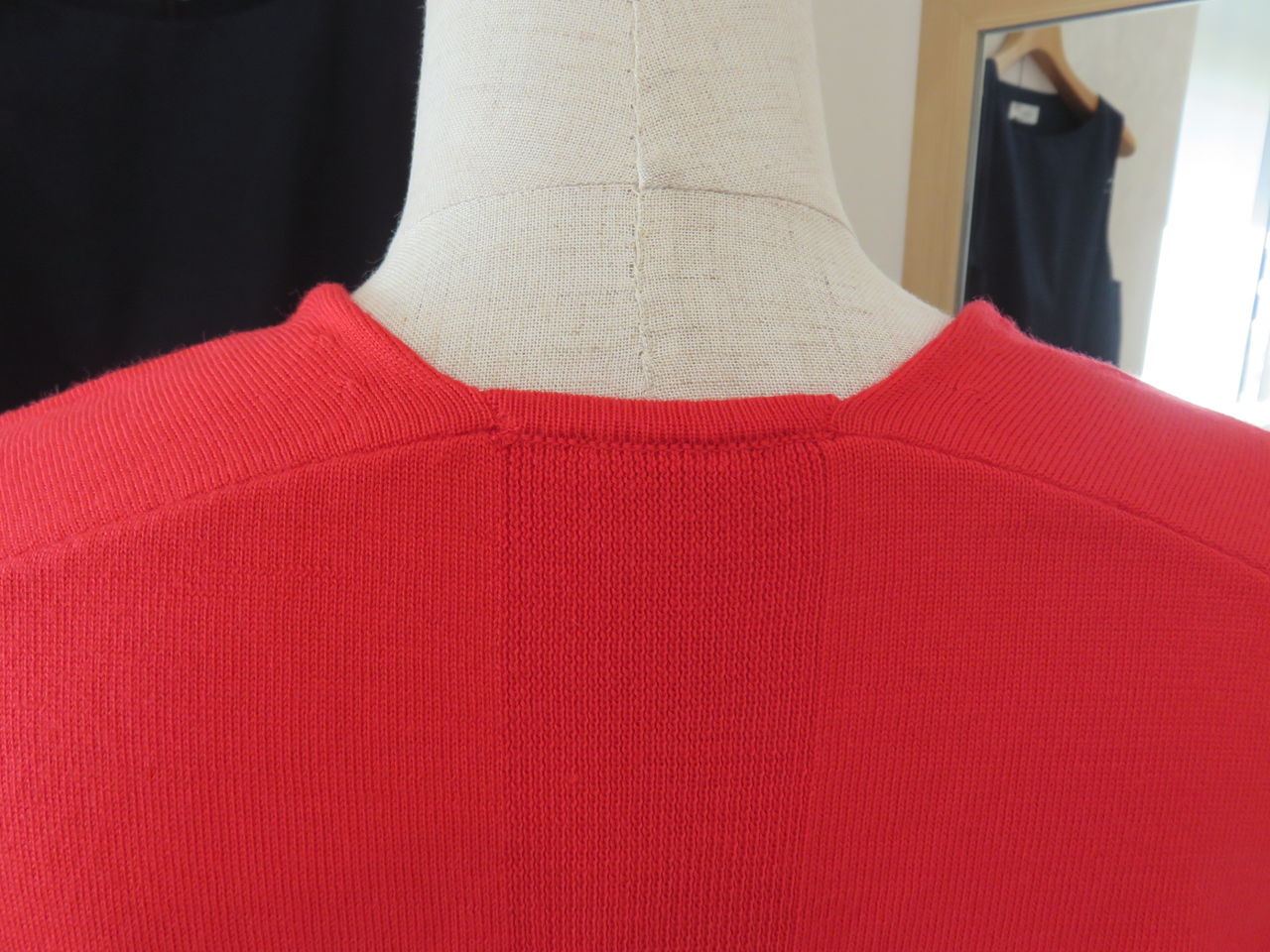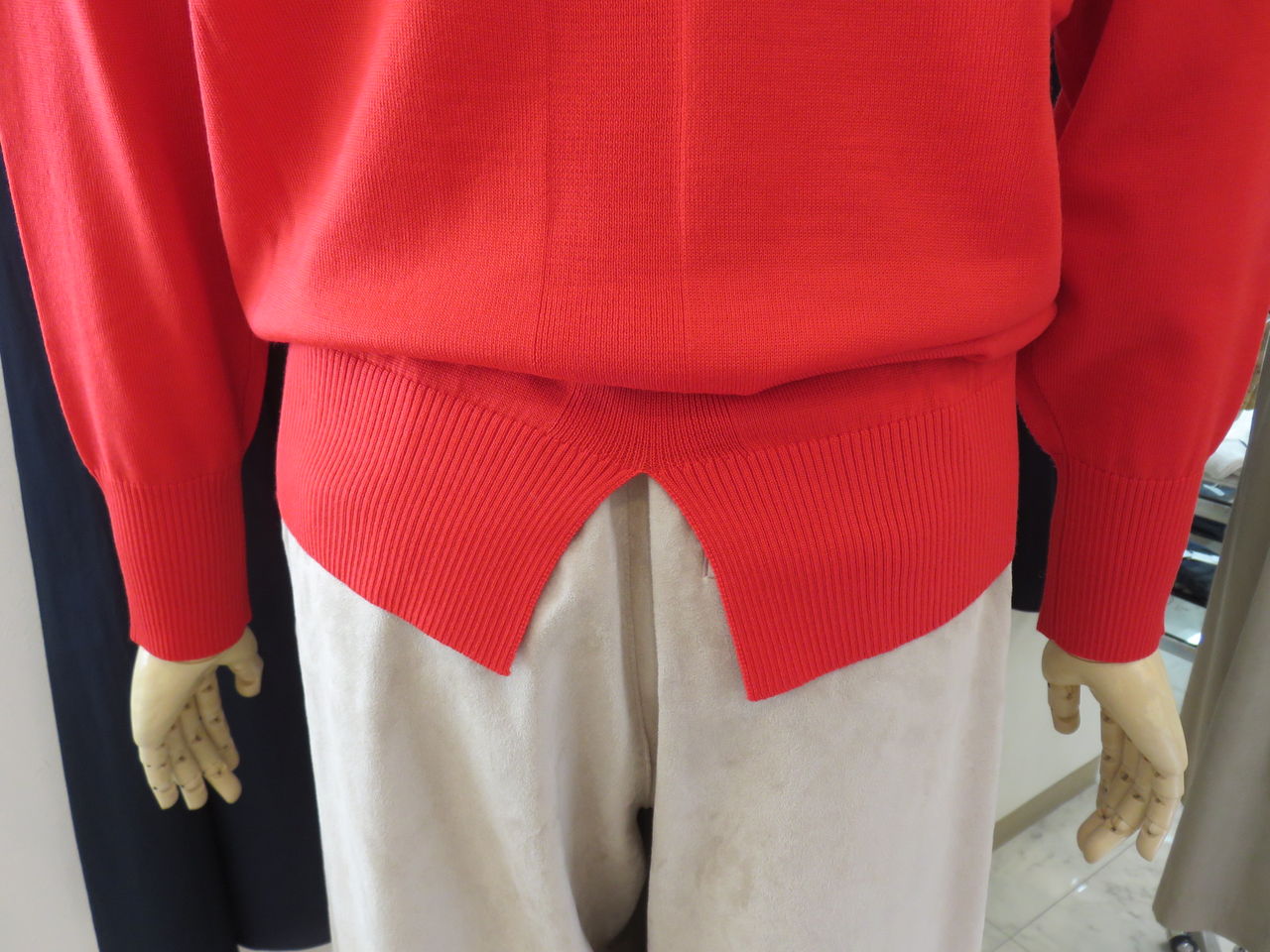 リブ編みの袖口と裾、後ろ中心裾スリット入り。