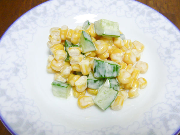 マヨネーズ 適量 ③ コーンの缶詰の汁を切り、きゅうりと混ぜ