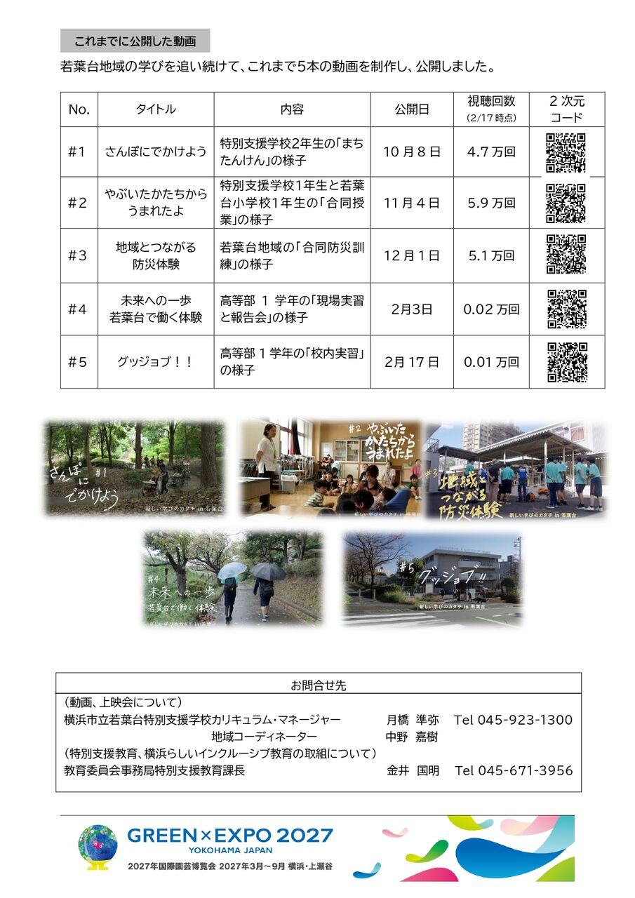 若葉台特別支援学校(わかば学園)は1昨年から若葉台小学校とともに、横浜らしいインクル―シブ教育にチャレンジしています。横浜市教育委員会では昨年1年間にわたって、この2校の子どもたちや教職員に密着して5本の短編動画を撮影しました。この度、その5本の短編にインタビューや未公開映像を加えた約30分の総集編を作成しました。