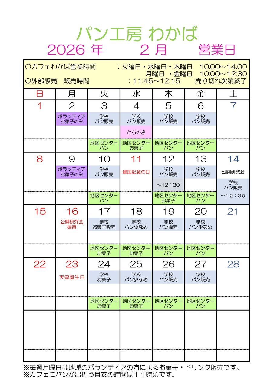 わかば学園のパン工房2月販売カレンダー