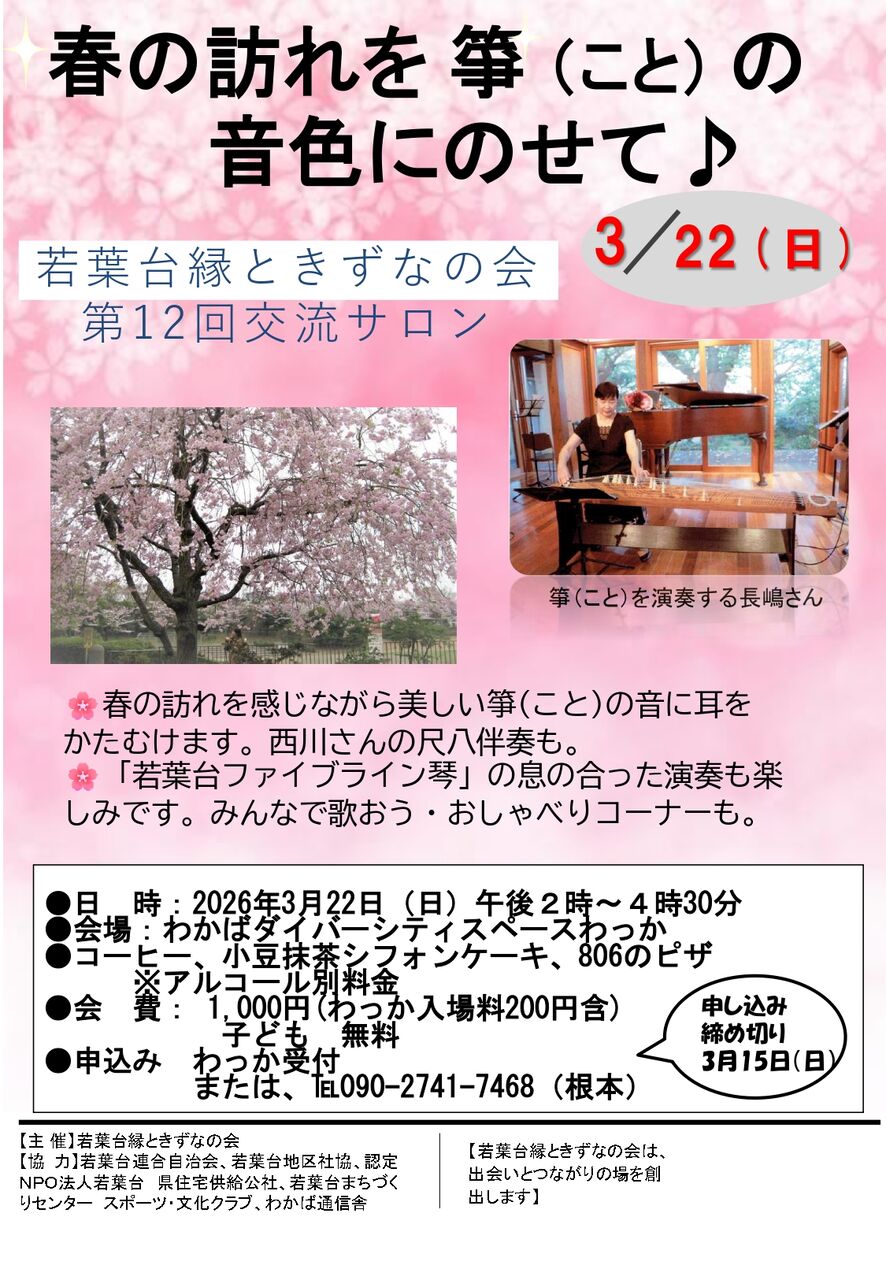 若葉台縁ときずなの会では、3月22日㈰に「春の訪れを箏(こと)の音色にのせて♪」を、若葉台のショッピングタウンにある「わっか」で開催する。開場は13時半、開演は14時から。