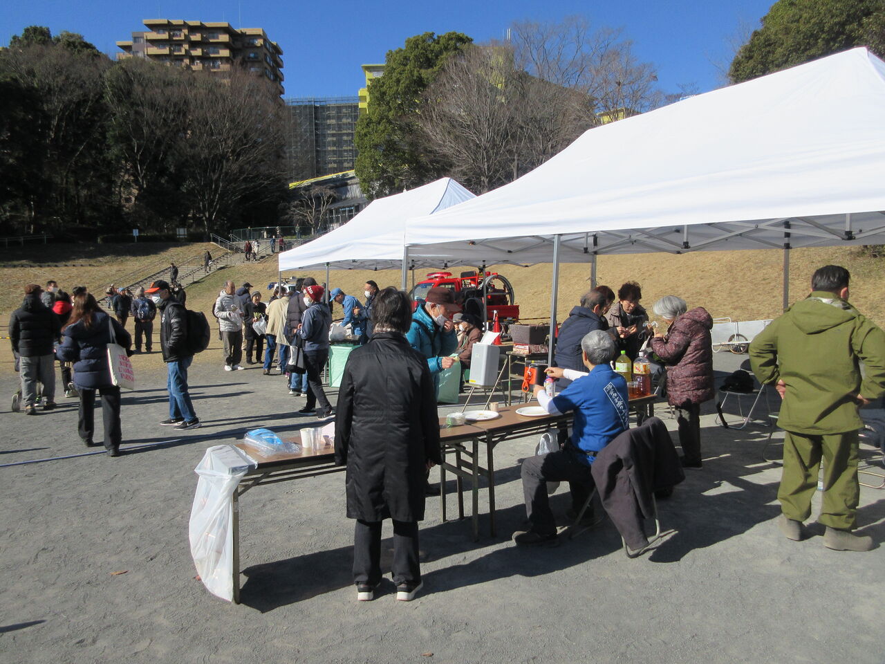 10時過ぎから若葉台を盛り上げる会などにより、グラウンドの真ん中に竹が組まれ、テントも設置してお飾りの受付が開始された。住民の皆さんが三々五々グラウンドに正月飾りを持参し、係が金属やプラスチック類などの燃えない部分を取り除いて、準備完了。 1時の点火に先立ち、どんど焼きの共催者である若葉台連合自治会菅尾会長、わかば会の磯本幹事長、若葉台まちづくりセンターの鵜崎部長および若葉台を盛り上げる会の小宮山代表の挨拶に引き続き、忙しい中駆けつけてこられた議員さんからも一言いただいた。