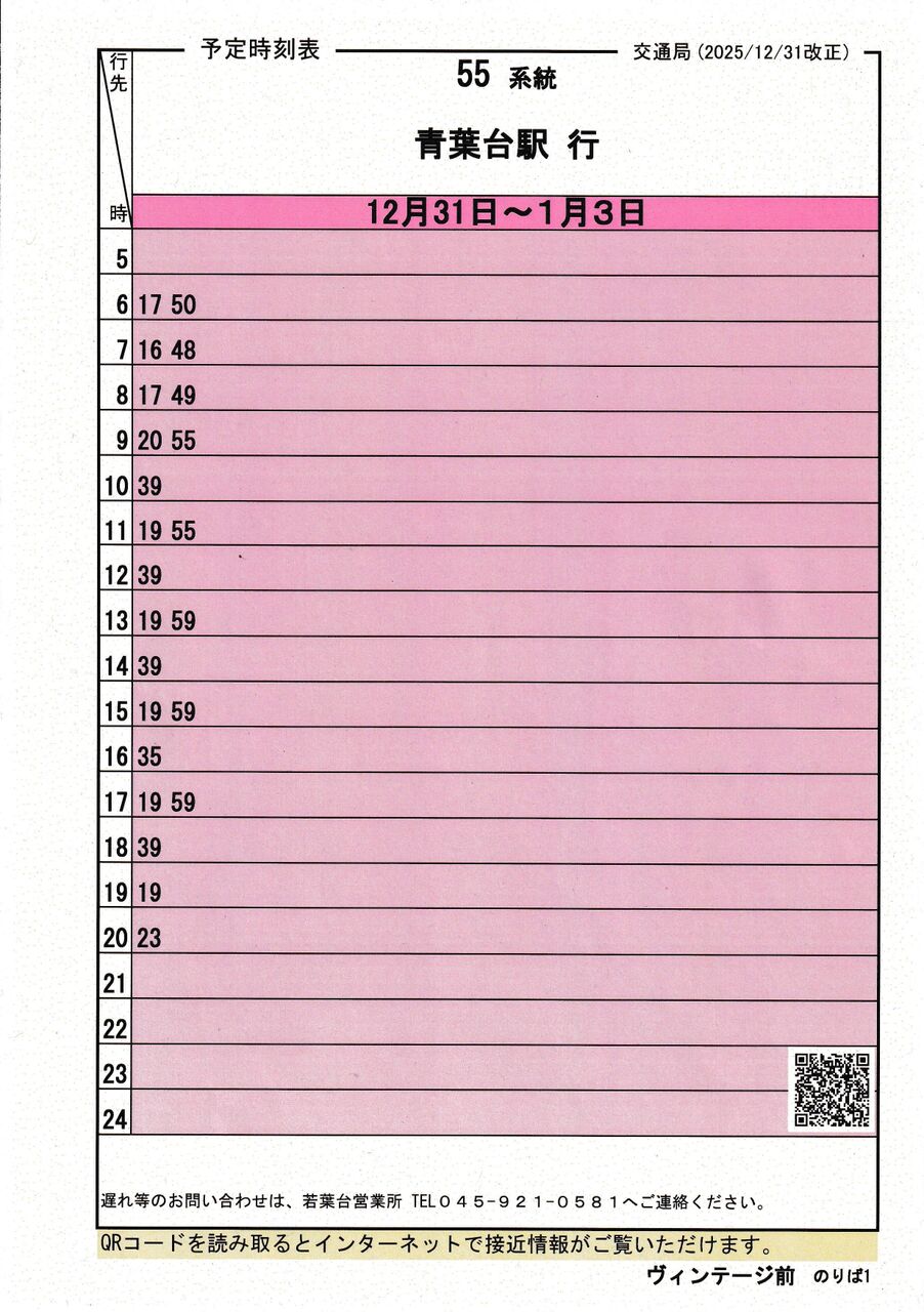 なお、345系統(55系統の急行ダイヤ)は学校が休みのため12月29日~1月3日まで運休になります。