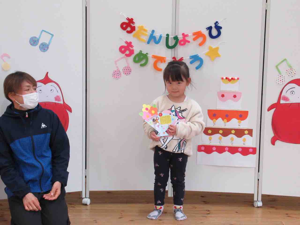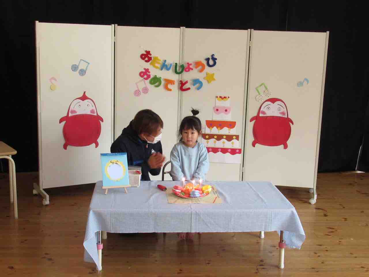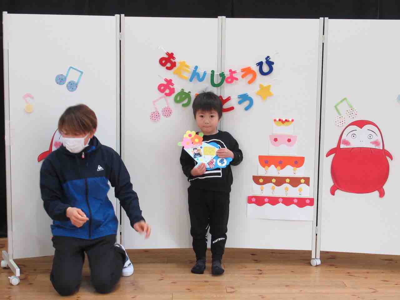 20221月27 🎉お誕生会🎂 1月生まれのお友達のお誕生会をしました。ちょっぴり緊張しながらみんなの前に出てきて質問に答えたり、担任の先生手作りのお誕生カードを貰って嬉しそうでした。その後は先生からの出し物のプレゼント。誕生児以外のお友達も楽しく参加していましたよ。その後は🎂のろうそくを「フ〜!」