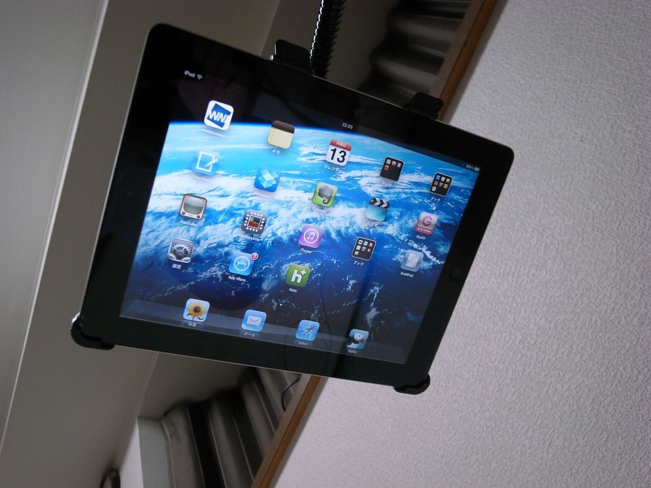 レグザタブレットAT570を購入してから、iPad2は自宅専用となりました。リビングや自室で毎日快適に使っていますが、ベッドに寝転んで使っていると重さで腕が疲れてくるのが難点でした。ウトウトして顔面を直撃しそうになったこともたびたびです(苦笑)。そこで、思い切ってiPadをベッドに固定するための「クランプ固定式くねくねスタンド」を購入しました。この製品は、iPadを固定するホルダーと、机の端やベッドサイドに固定するクランプ付きフレキシブルアームならなっています。ホルダーは、プラスチック製の爪で固定するタイプですが、iPad2にジャストフィットで簡単に外れることはなさそうです。クランプ部をベッドに取り付け、ホルダーに装着したiPad2をアームに固定し、アームをくねらせて見やすい角度に調整したらあっという間に「寝ながらiPad生活」が実現してしまいました。いやあ、これは実に快適です。寝転んで手を伸ばして画面にタッチするだけで楽々操作できるようになりました。なんだか、SF映画でみた宇宙船内での機器操作みたいで、テンションも上がりますね(笑)。しかし、私の場合、寝転ぶとすぐ眠くなるので、動画視聴の途中で寝てしまうのが難点です(笑)。2012年09月01日