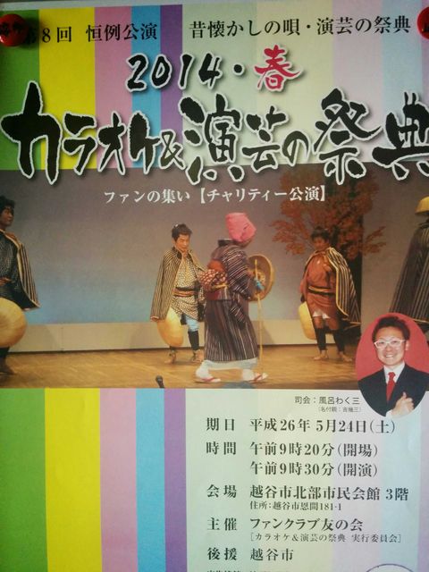 2014年05月26日 綾友会 先週土曜日、大袋の北部市民会館にて綾友会さんのカラオケ&演芸の祭典が開催されました。 ボクもわざわざ写真入りのポスターを作って頂き有難い! 朝の9時30分から開演し、終演が18時30分。 出演者の皆さんもさぞクタクタになっただろう…と思いきや、皆さんはまだまだ元気でした。 一番若手のボクが一番疲れていたとは、頑張らなきゃいけませんな。 お世話になりました。