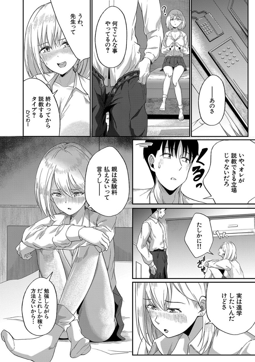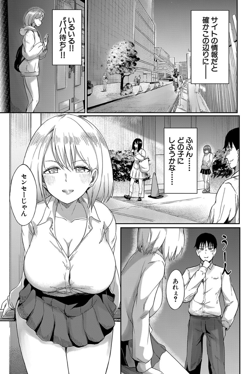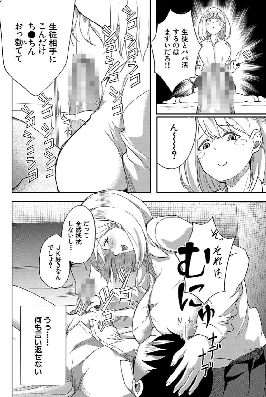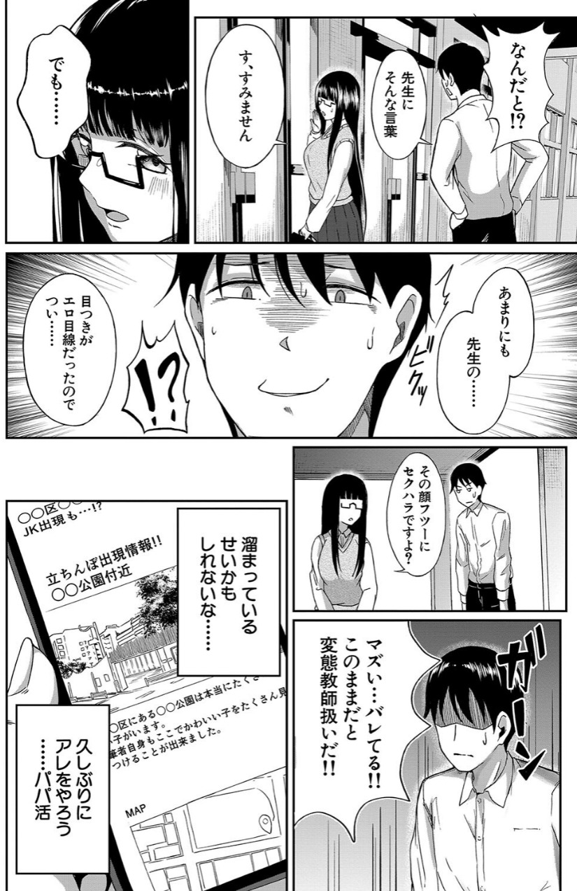 JK好きの教師奥田は、女子校勤務で劣情を催す日々。それが表情に出てしまい、女生徒から指摘される始末。困った奥田は滾った性欲を解消する為、パパ活女子が集まるパパ待ちスポットへ行く。そこに居たパパ活女子・姫野は、奥田が勤める学園の生徒。