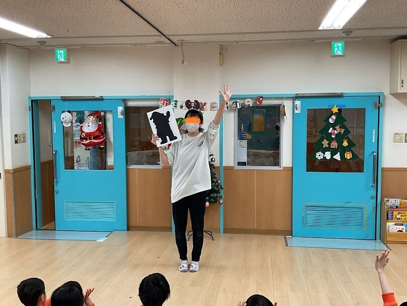 保育者からの出し物は、シルエットクイズ!答えが分かるとすぐに手を挙げて答えていました。