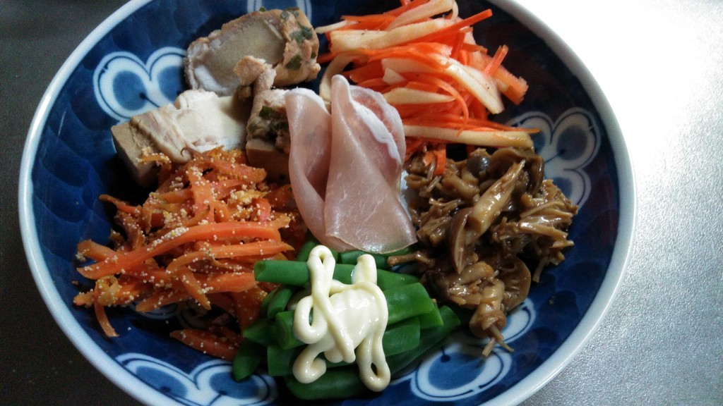 左からきのこ味噌・人参のたらこ炒め・いんげん茹でたの
