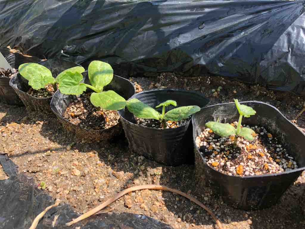 上の写真は、ズッキーニです。遅く発芽したものも含めて順調です。