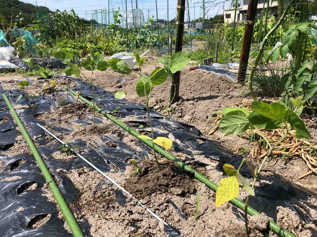 間引いたものは、別のマルチ穴に移し替えて植えています。