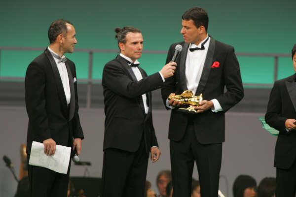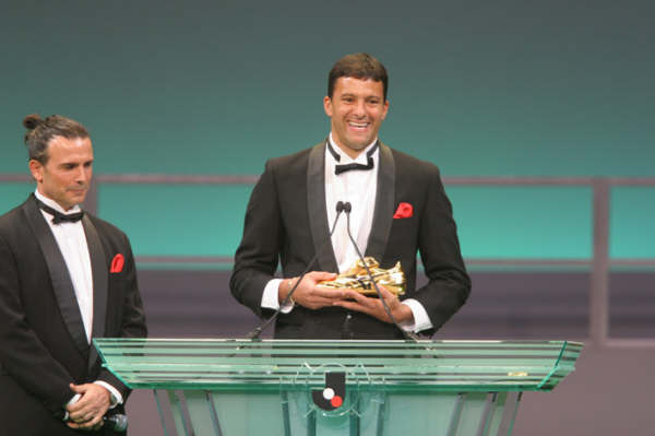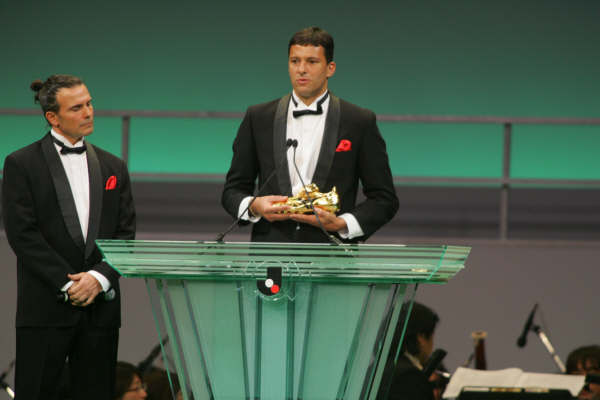 今日ここに載せるいくつかの写真は、実は去年のもの。でも僕が受け取ったのは最近なんだ。2006年度のJリーグ得点王と最優秀選手賞を受賞した時のものだ。僕のこんなスーツ姿なんてめずらしいだろう(笑)!?